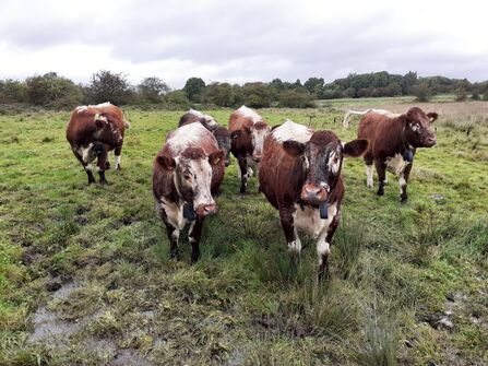 Next stop was to say hello to the conservation grazing herd. Eight English Longhorn cattle were sitting happily, although one had lost its no fence collar. Stephen showed me the app on his phone which allows him to know where they are at any time. They are a hardy breed and stay out all year, provided the ground is not too wet. They graze in patches and you can read more about their successes with this scheme here.