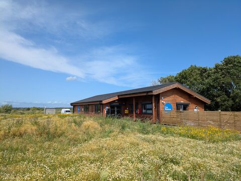 The Learning Centre, a wooden single storey building with a wildflower meadow in front and a fence. There is a blue sky above.