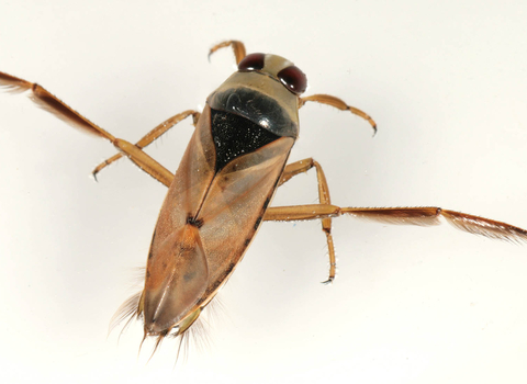 The common backswimmer is widespread and common in ponds, ditches and canals across the UK. It can swim upside-down through the water, often near the surface where it grabs insects that have fallen into the water film. It is an active and voracious predator, hunting many smaller invertebrates, tadpoles and small fish. Sensing the vibrations of its prey, it charges at it with lightning speed and stabs it with its 'beak', injecting toxic saliva into the wound so it can suck out the contents of the body. Common backswimmers mate between December and May, laying eggs from February onwards. The larvae go through a number of moults before reaching adulthood.How to identify
