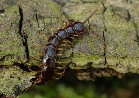 The brown centipede (also known as the 'stone centipede' or' common centipede') is one of a number of centipede species found in the UK. Centipedes are long, many-segmented invertebrates that live in the soil, under rocks, in compost heaps, or under the bark of trees, emerging at night to catch their prey. The most familiar centipedes are the Lithobiusspecies, which can be found under rocks in the garden. Although some centipedes do have more than 100 legs, the brown centipede has just 15 pairs - one on each segment of its body. They have venomous claws on each side of their heads, which enable them to catch their prey, and large, biting jaws, but they are harmless to humans.