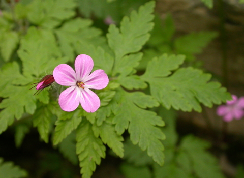 Herb-robert is a low-growing plant, with small, pretty, pink flowers. Look for it in shady spots in woodland, hedgerows and coastal areas.